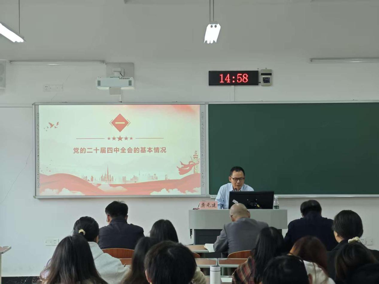 为深入学习领会、全面准确把握党的二十届四中全会精神的重大意义和核心要义,引导广大师生把思想和行动统一到党中央决策部署上来,2025年11月4日,我校科研处学报三峡研究院党支部与公共管理学院联合邀请万州区委党校副校长龚元建同志来校,为两个部门的部分师生作党的二十届四中全会精神专题宣讲。会议由三峡研究院王志清同志、公共管理学院赵翔宇同志共同主持,学校组织员谭力同志全程参与活动。