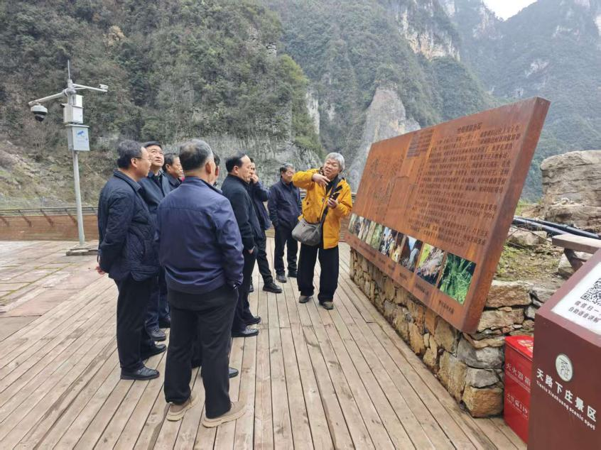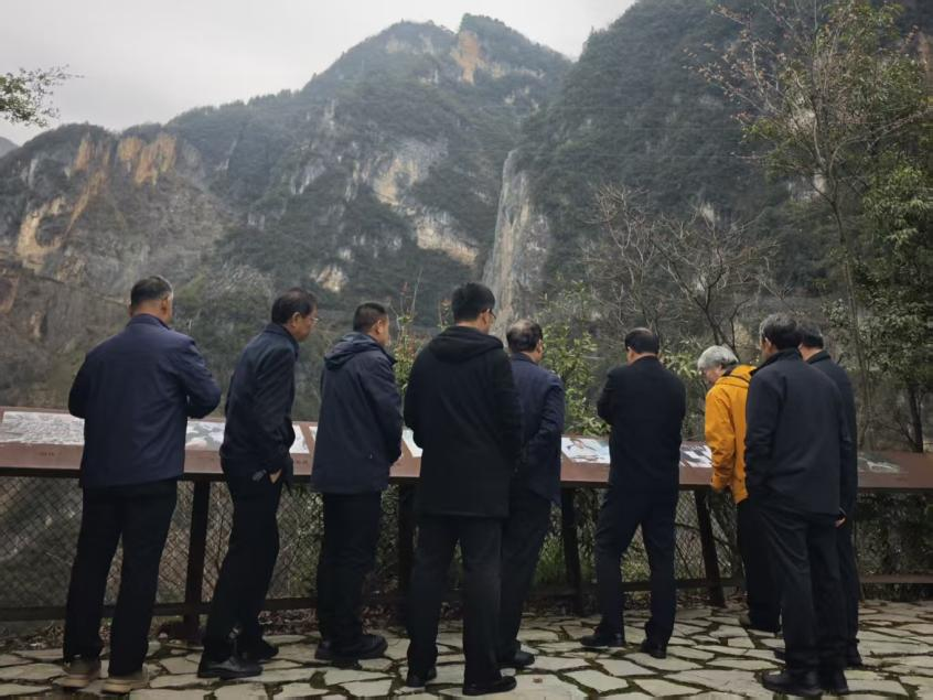 当日下午,在三峡研究院院长王志清主持下,调研组首先前往天路景区进行现场考察。在展示下庄自然环境与修路背景的信息牌前,成员们认真聆听了下庄精神的发掘者、见证者、记录者,重庆“十佳”新闻记者侯长青的现场讲解,深入了解下庄村曾经的闭塞困境以及村民们决心开凿天路的时代背景与现实动因。